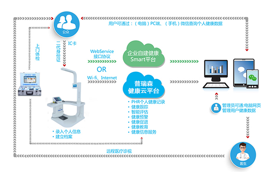本公司自主研发的健康一体机设备,在一台标配设备上,可以实现:自助建档、身高、体重、BMI、血压、脉率、血氧浓度、血糖、尿酸、总胆固醇、人体成分、心电图等日常人体重要的健康参数,同时建立手机移动端智能服务,保健品、药店、美容机构只需在场所投放一台一体化体检设备,就可为VIP客户提供全程无间断的健康管理增值服务。