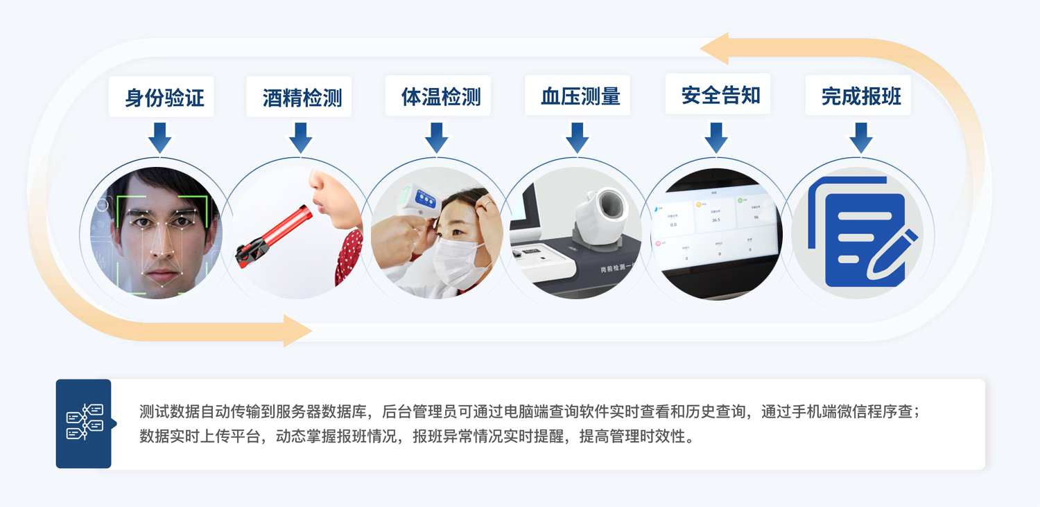 岗前健康检查一体机是一种用于进行员工健康检查和筛查的设备,可以通过指纹识别、人脸识别等方式快速登录,并可准确地检测员 工的健康状况,包括 血压、心率、酒精、体温、血氧 等多个项目,对于符合上岗健康状态得员工允许考勤打卡。