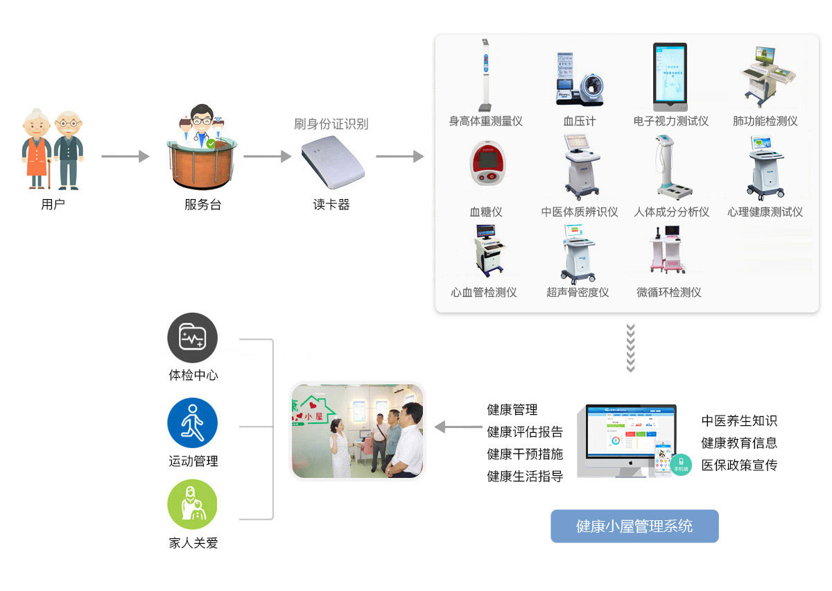 健康小屋是根据时代发展、社会需求与疾病谱的改变,搭建的一种全局的健康检查方式,由政府主导,公共卫生机构提供,或者企事业单位、社区、养老机构等自建,以提供全面的健康服务,提高辖区人员整体健康水平,树立完善的服务品牌。