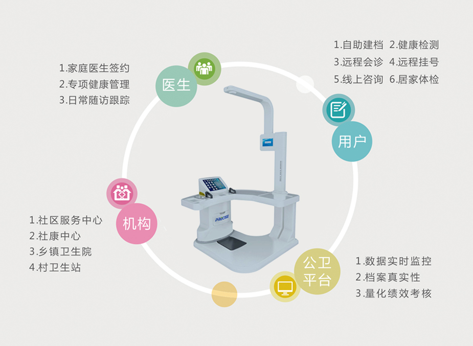 本公司自主研发的健康一体机设备,在一台标配设备上,可以实现:自助建档、身高、体重、BMI、血压、脉率、血氧浓度、血糖、尿酸、总胆固醇、人体成分、心电图等日常人体重要的健康参数,同时建立手机移动端智能服务,保健品、药店、美容机构只需在自己的场所投放一台一体化体检设备,就可为VIP客户提供全程无间断的健康管理增值服务。