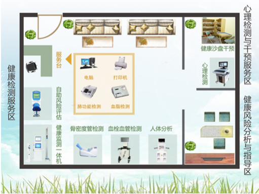 健康小屋配置分两大部分组成:测量工具配置和干预指导配置。 1、测量工具配置。就是配置常用的简便的测量设备,如身高仪、体重仪、血压仪、肺功能仪、血糖监